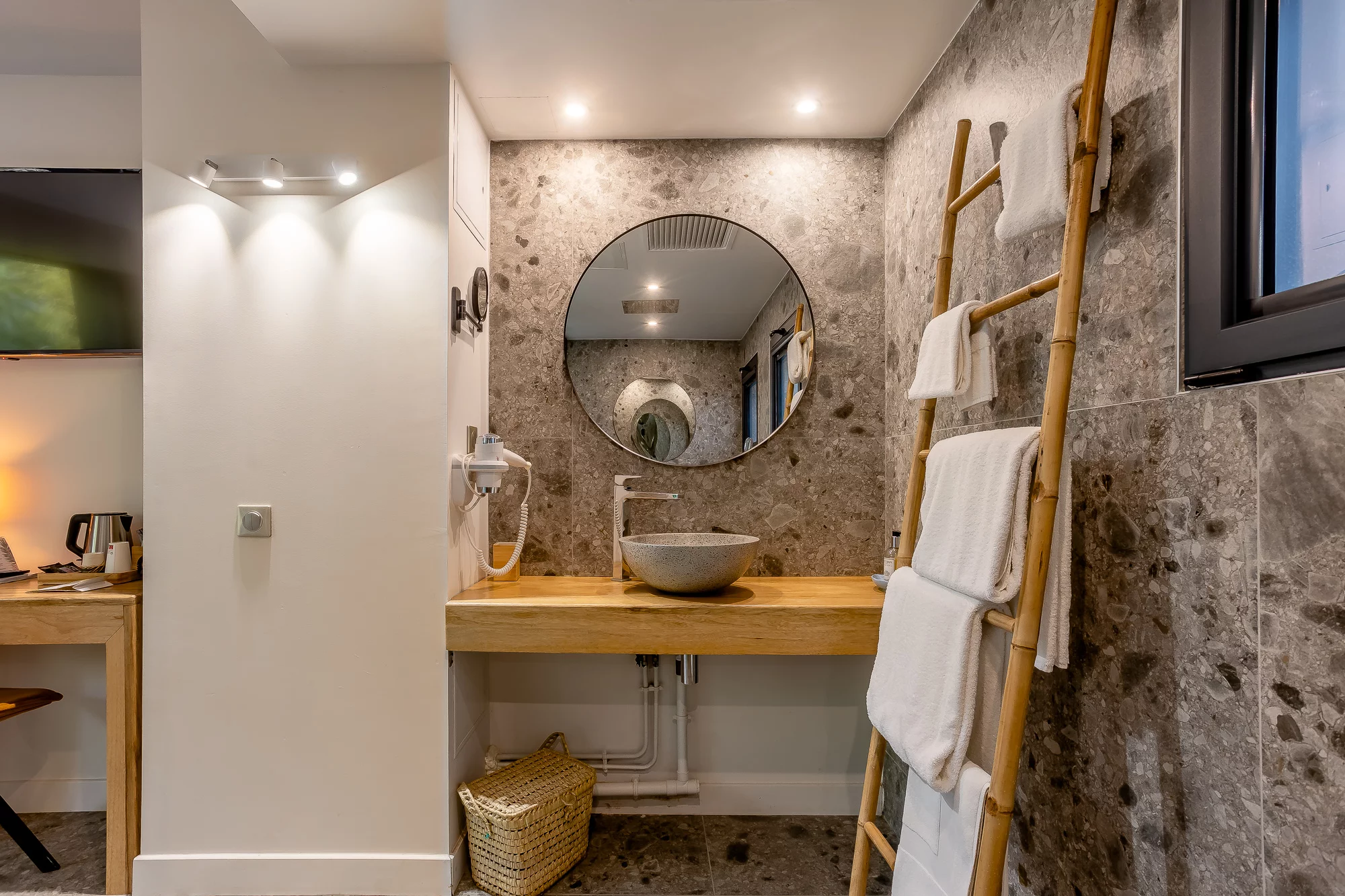 Nos 2 chambres « Confort – PMR » situées en rez-de-jardin sont dotées d’une décoration soignée qui invite au lâcher-prise et à la détente.