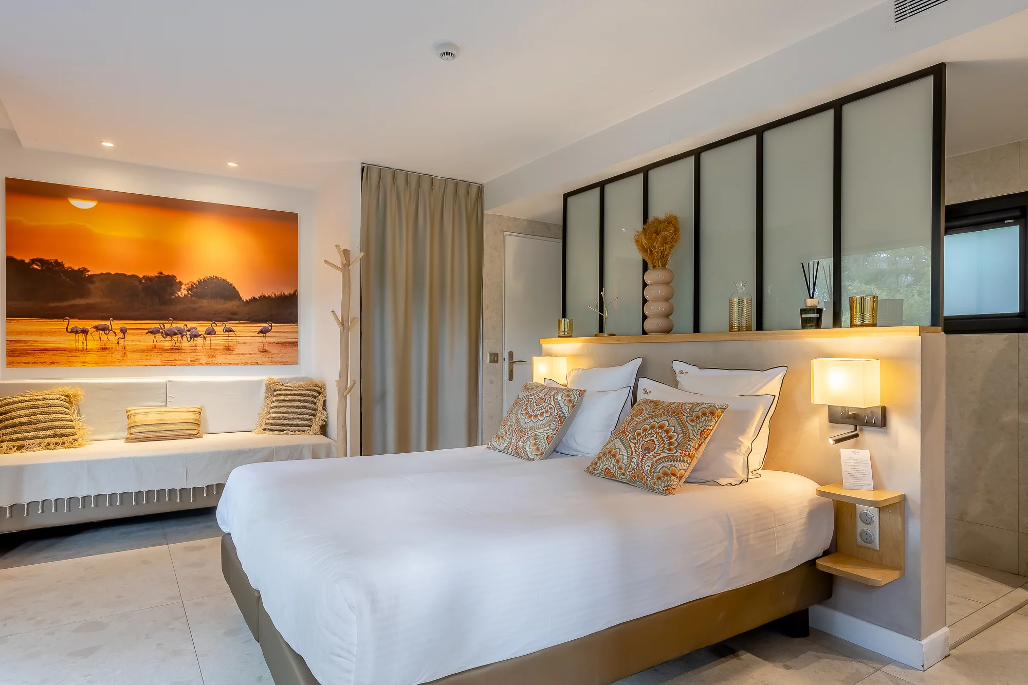 Nos 8 chambres « Supérieur » situées au premier étage, sont dotées d’une décoration soignée personnalisée qui invite au lâcher-prise et à la détente. Offrant une large vue sur la végétation luxuriante du jardin, les terrasses et la piscine chauffée.