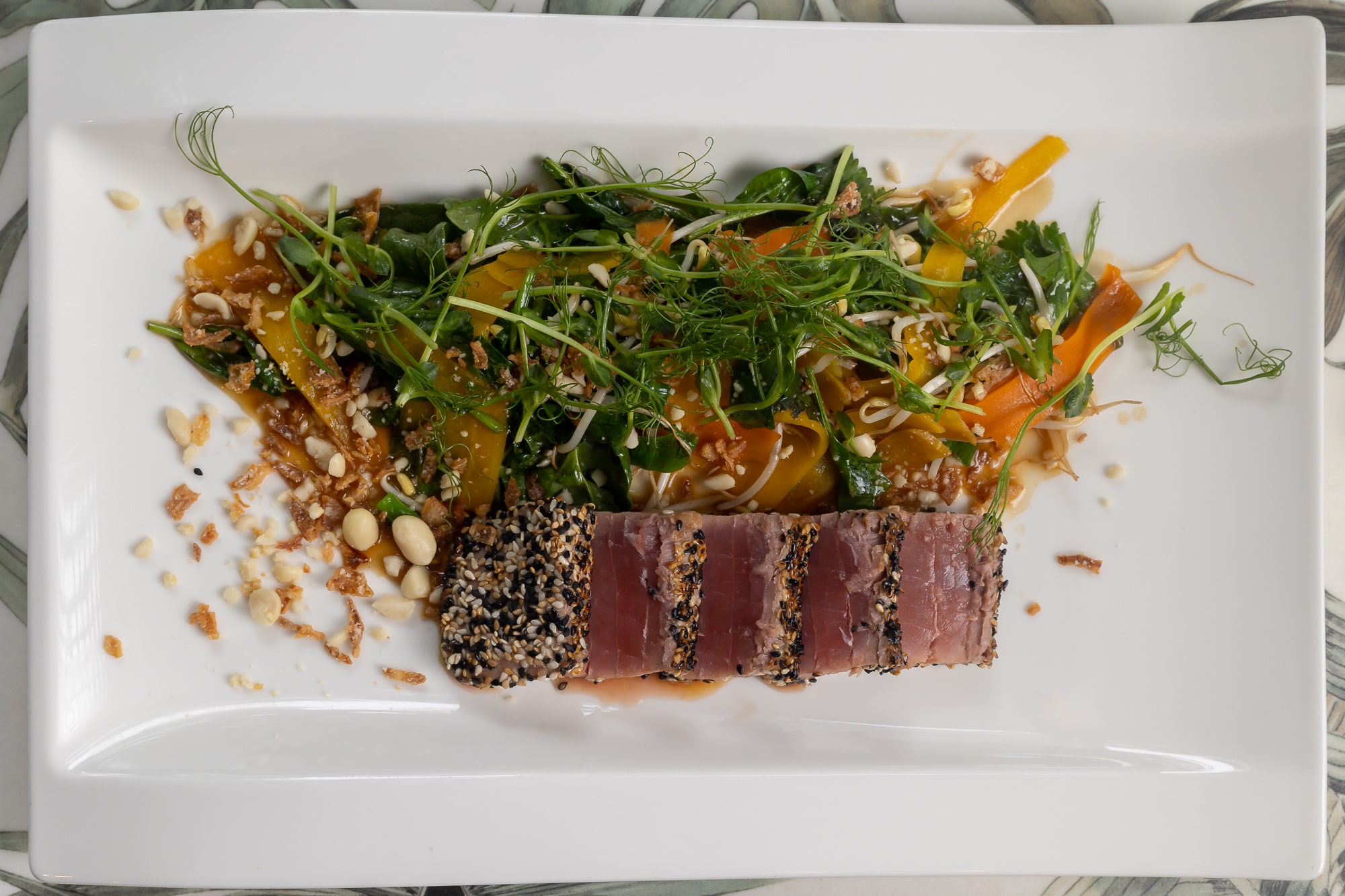 Carpaccio de bœuf Angus façon tataki, pickles d’oignons rouges, sésame croustillant, wasabi, sauce yakiniku.