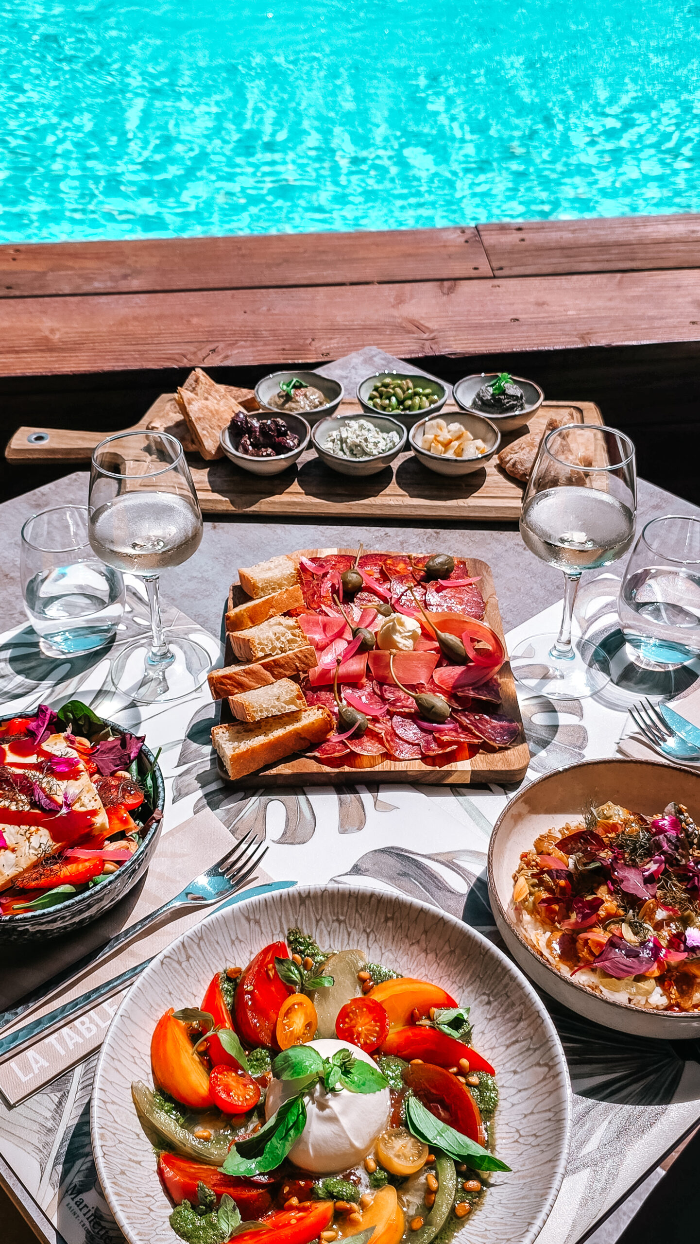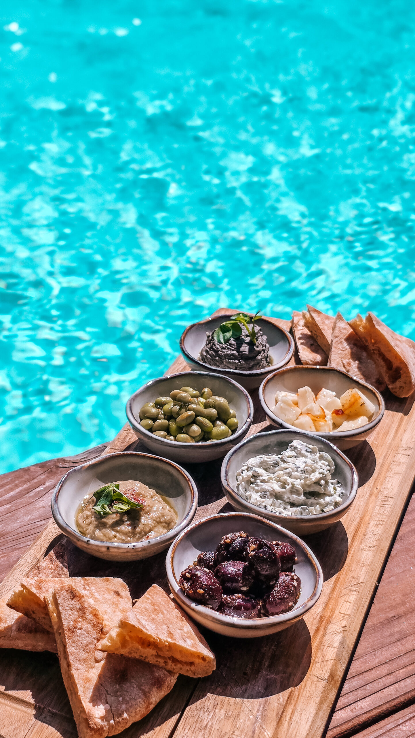 Houmous, ktipiti, houmous de betterave rouge, halloumi grillés, olives noires kalamata aux épices, edamame, pain pita.
